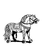 Three Greek warriors in battle formation Trojan horse on wheels with decorative ornaments